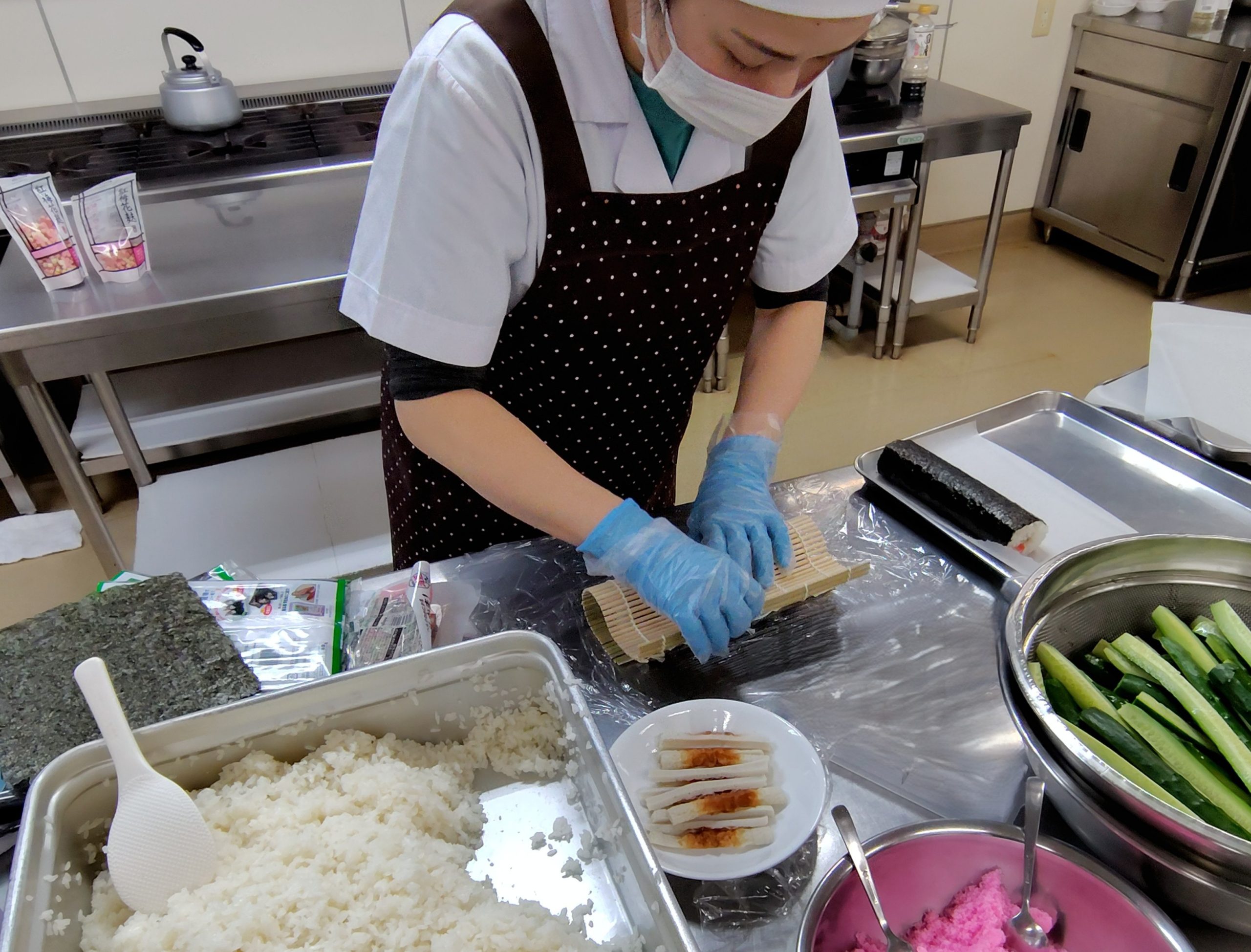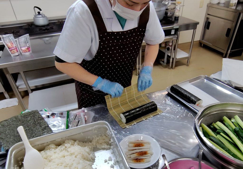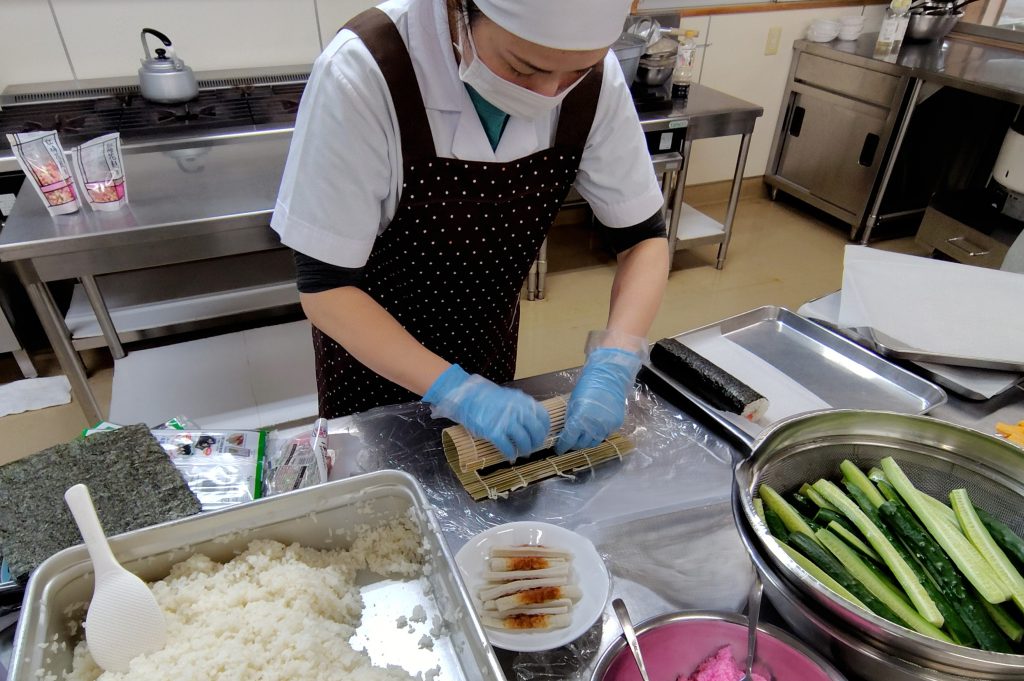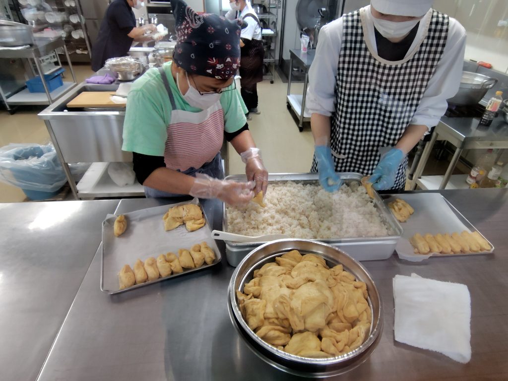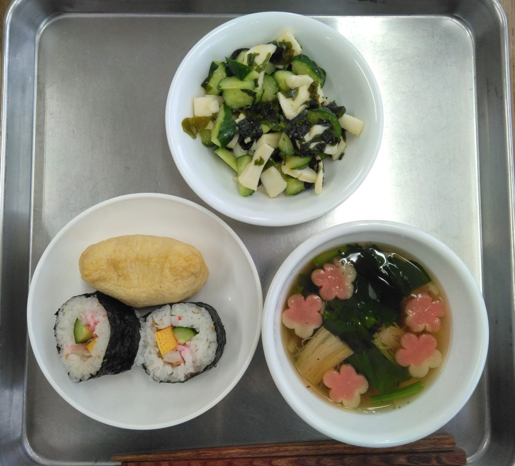 いなりずしと太巻き(3月3日) 今日のはと保育園はひなまつり会でした。 給食はいなりずしと太巻きといかときゅうりの酢味噌和えにおすまし おいなりさんはふっくら煮えた油揚げにごまが入った酢飯を上手に詰めていきます 太巻きは くるくる・・・ できたー! アレルギーのあるお子さんには たまごの入っていない竹輪、カニカマを使って作っています 子どもたちは喜んで食べていました(⌒∇⌒)