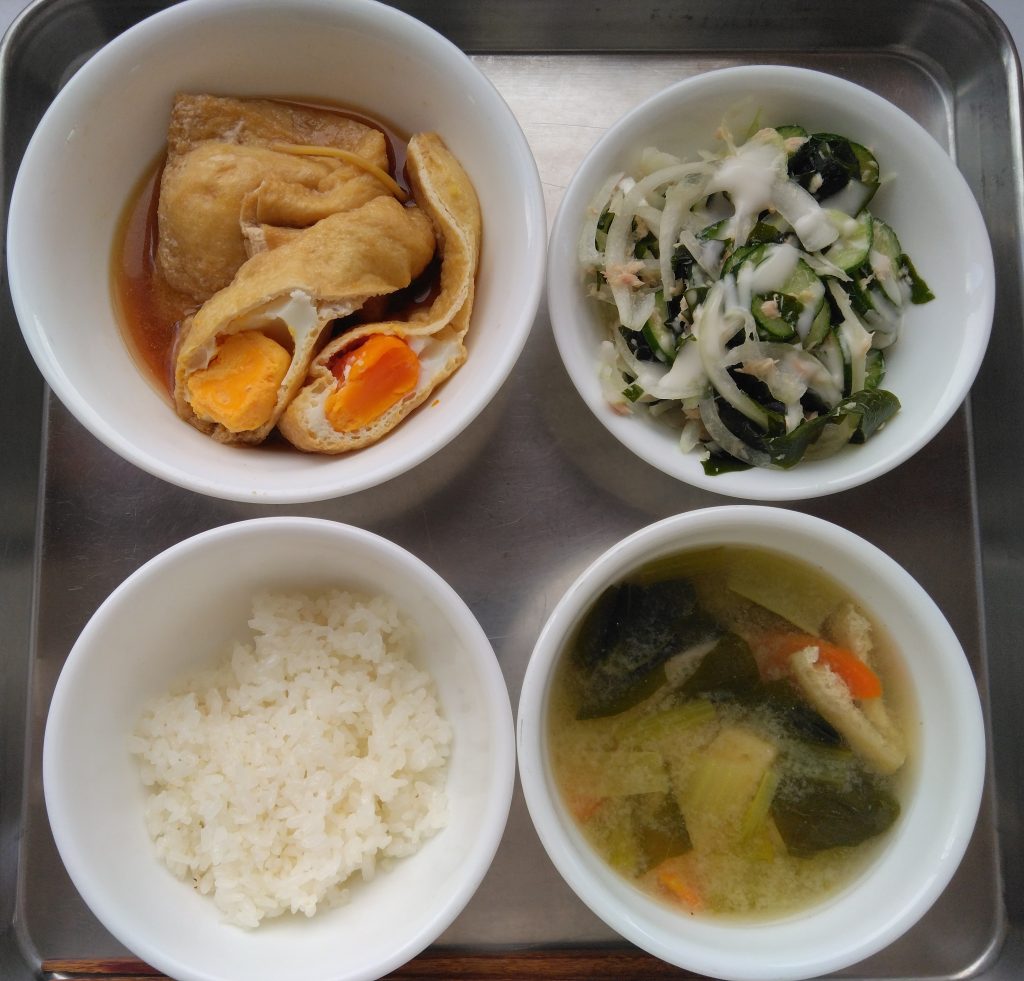 信田袋煮卵とわかめサラダ(11月26日) 今日の給食は、信田袋煮卵とわかめサラダ 今日の信田袋は卵入りでした🥚 油揚げを破けないよう、丁寧に開き、たまごを投入 スパゲッティで口をとじます おいしい給食に子どもたちも大喜び(⌒∇⌒)