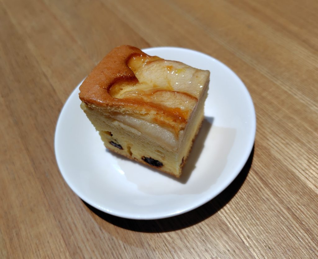 ふわふわの生地に干しぶどうが入って上に薄切りにしたりんごを並べて焼いてあります