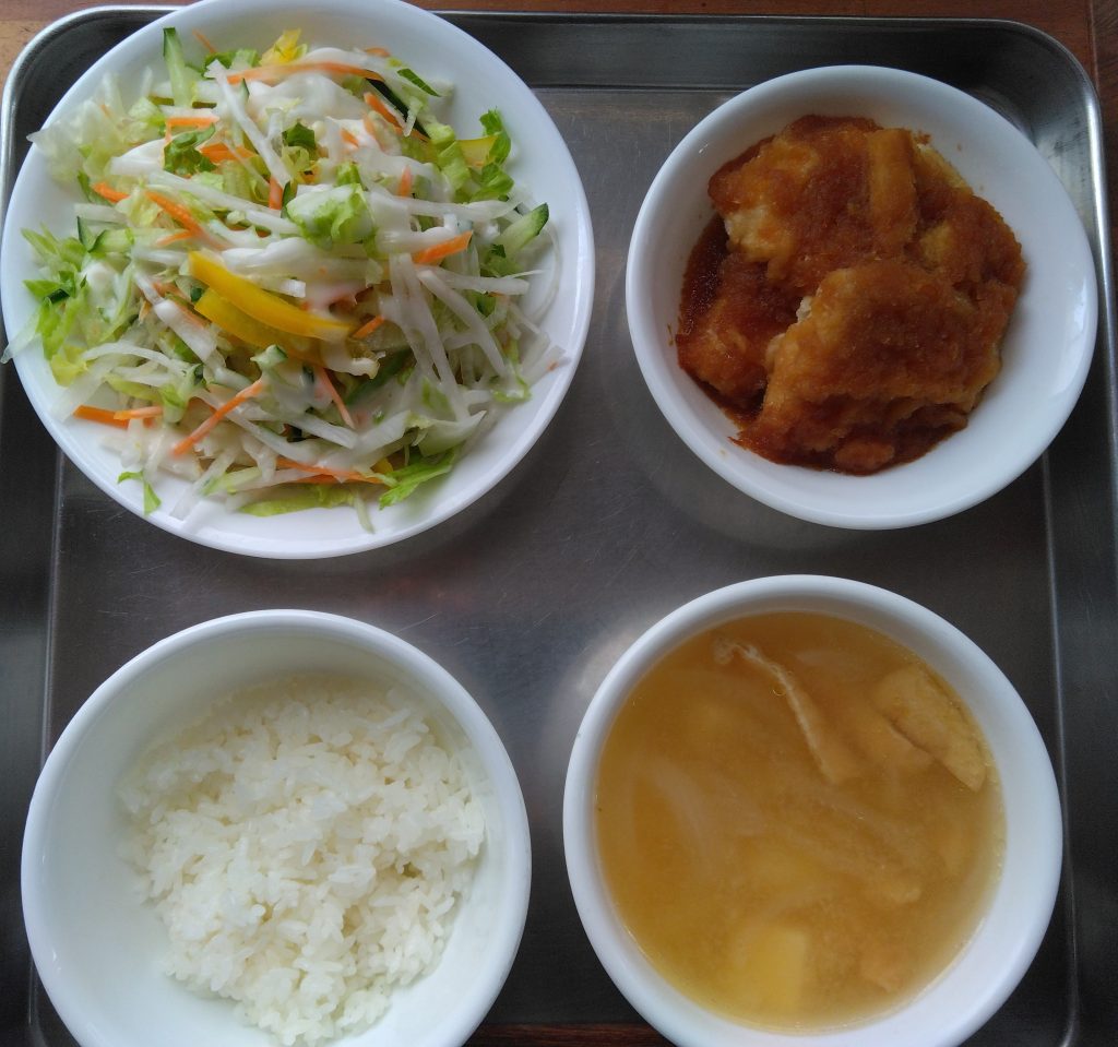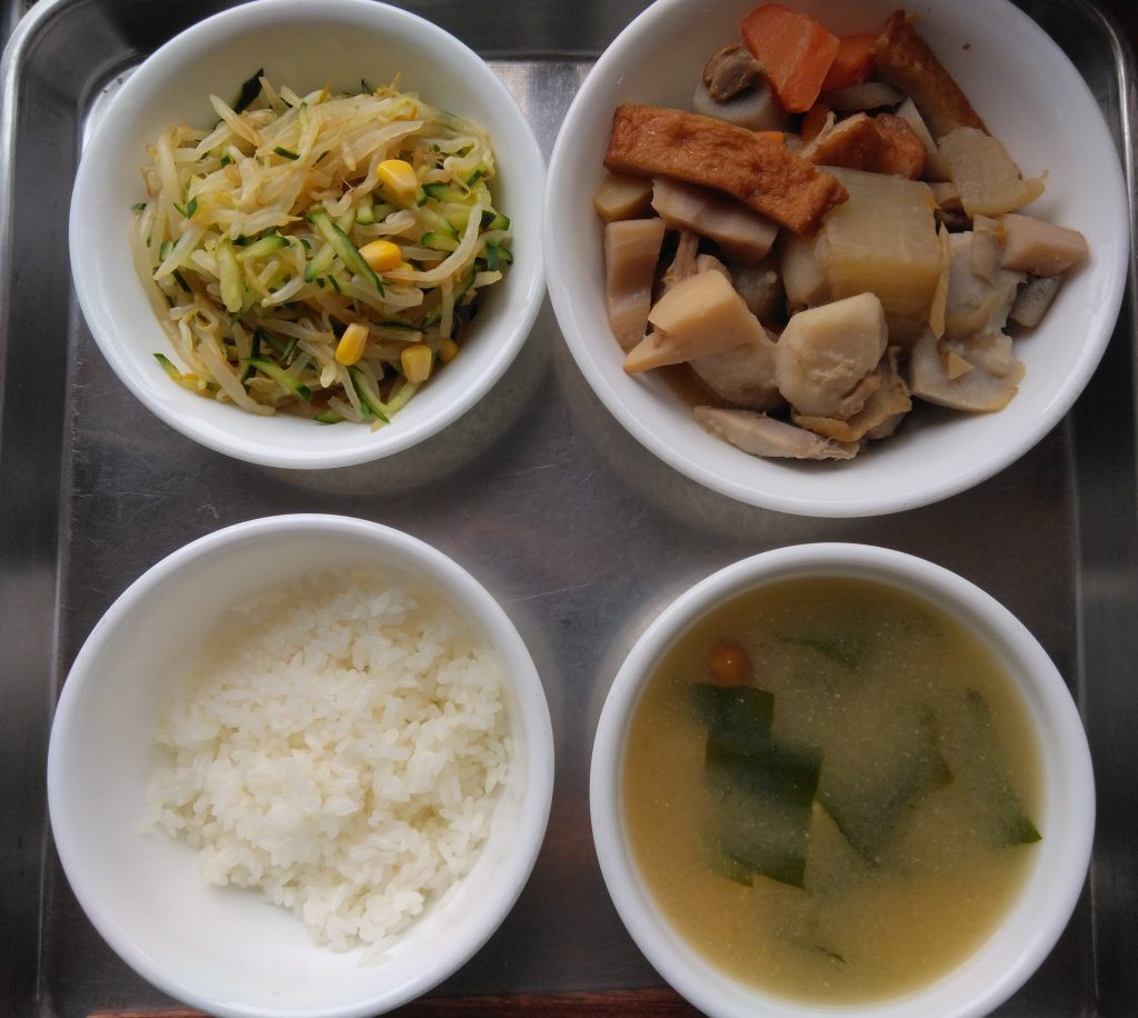 給食のご紹介 10月6日(月)筑前煮とコーン・もやし・きゅうりの酢の物 里芋、ごぼう、大根、人参、しいたけ、れんこん、たけのこ・・・と根菜が豊富✨ そこにこんにゃく、さつま揚げ、鶏もも肉も入ってボリューム満点! 家庭ではこんなにたくさんの種類をそろえるのはなかなか大変ですよね。 給食のありがたみを感じる一品です。 10月7日(火)魚のバーベキューソースと千切りサラダ バーベキューソースはすりおろしたりんごにレモンのしぼり汁を加えたさわやかな酸味で食欲をそそります。