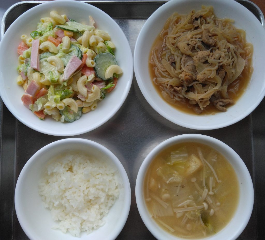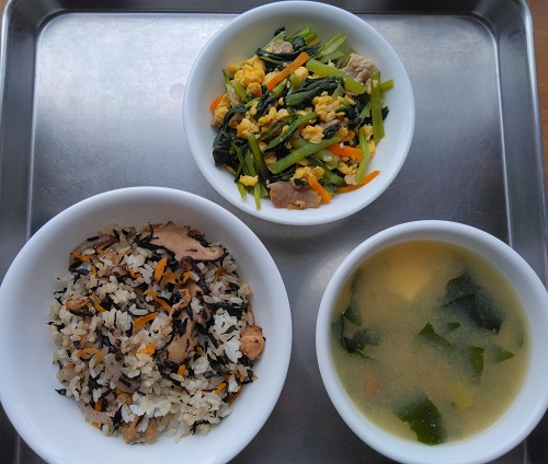 今日の給食は、ひじきごはんと小松菜と豚肉と卵の炒め物