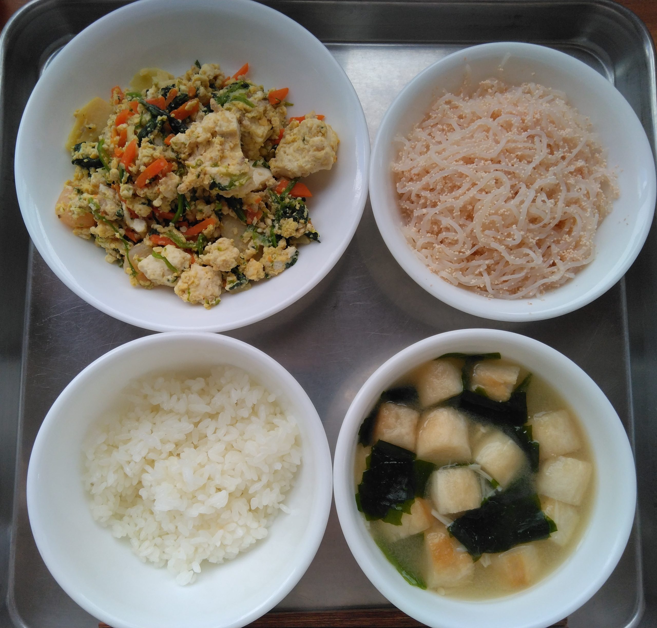 今日の給食は、炒り豆腐としらたきのたらこあえ