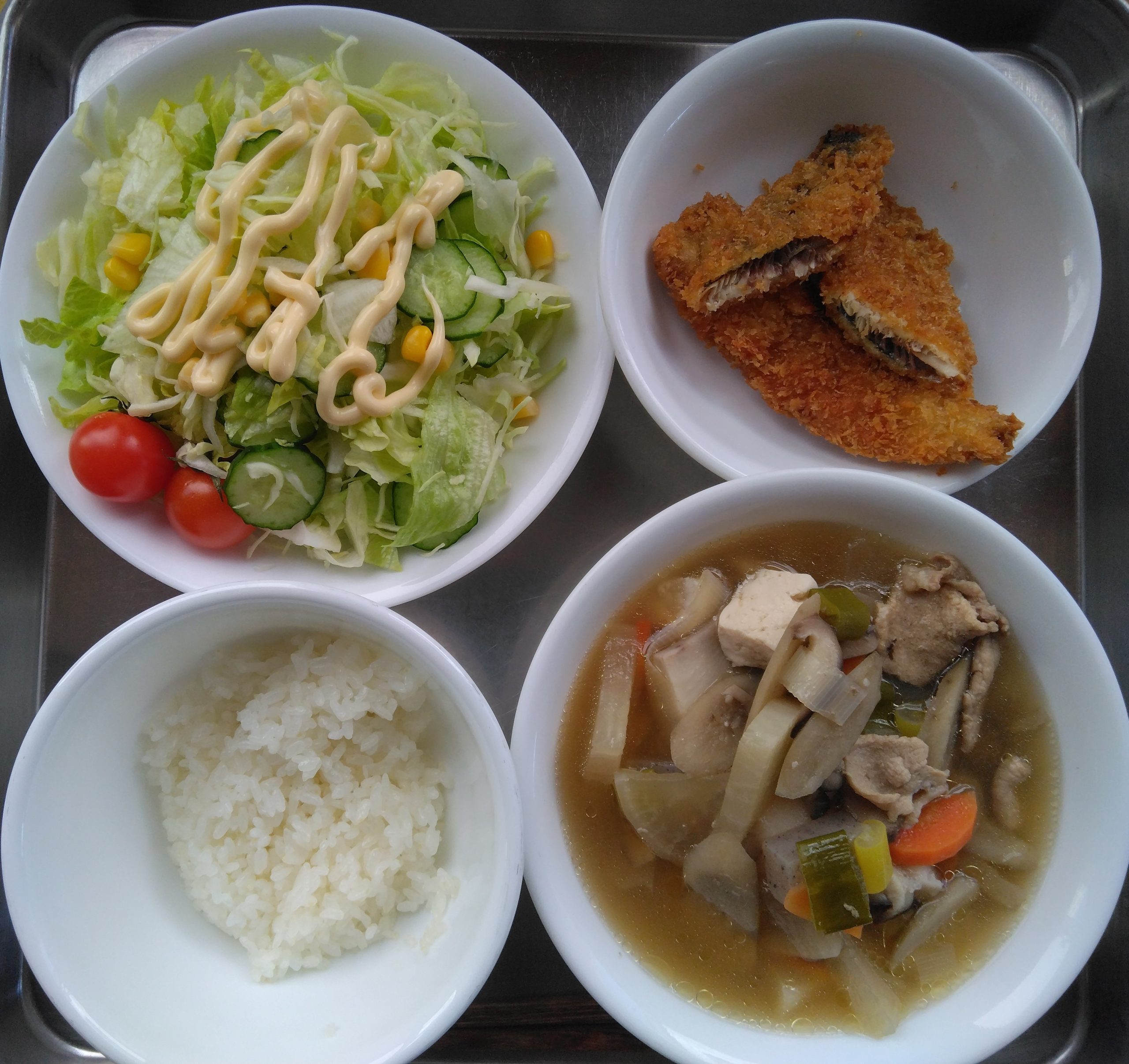 いわしのフライと野菜サラダ(2月3日) 今日の給食は、いわしのフライと野菜サラダ 今日は節分なのでいわしを食べます サクサクに揚がっています 子どもたちは今日は鬼が来る・・・とソワソワしていましたよ。 👹鬼はいつ保育園に来るのかな?