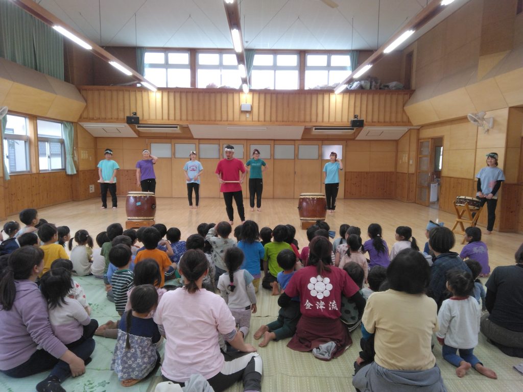 0歳~5歳までホールに集まり、職員がたたく太鼓をみんな真剣に見ていましたよ👀