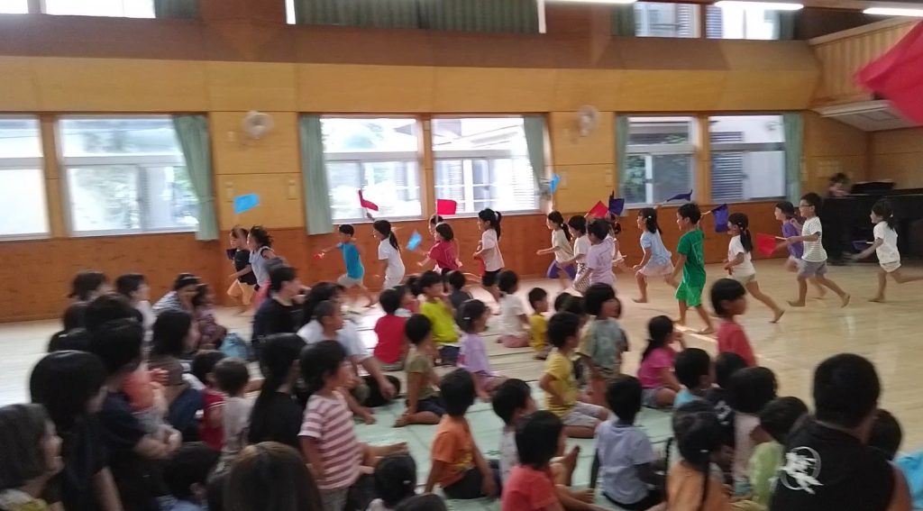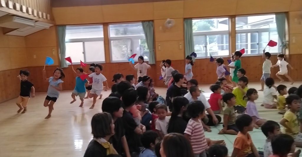 色とりどりの旗を持って走り回ります。