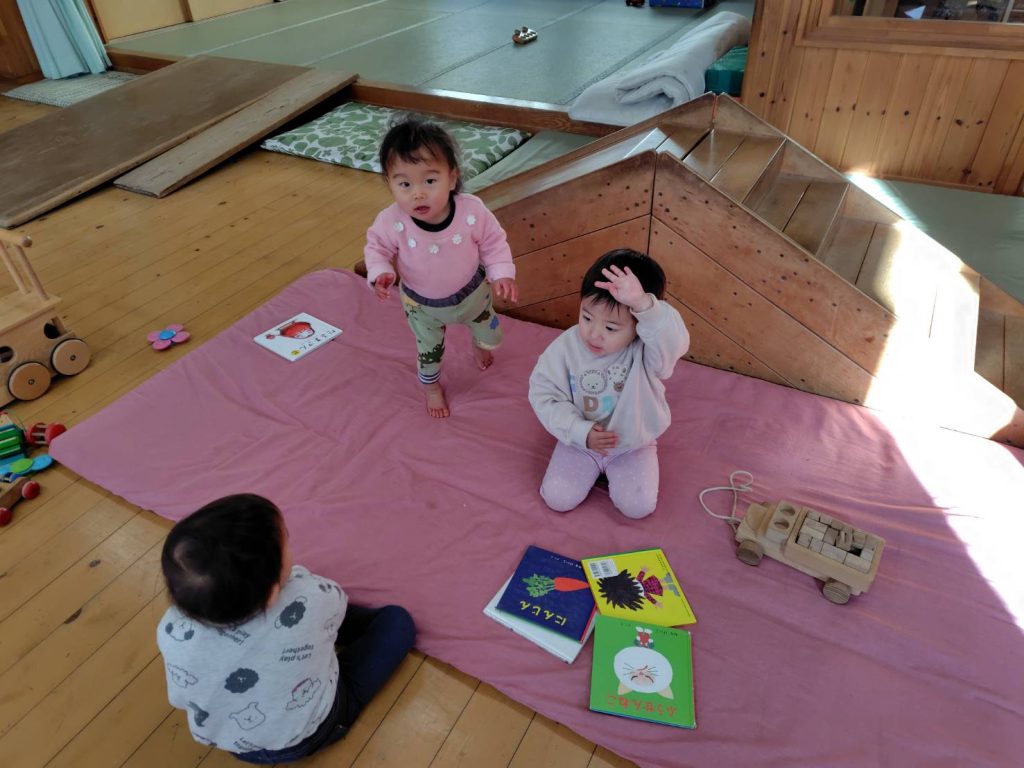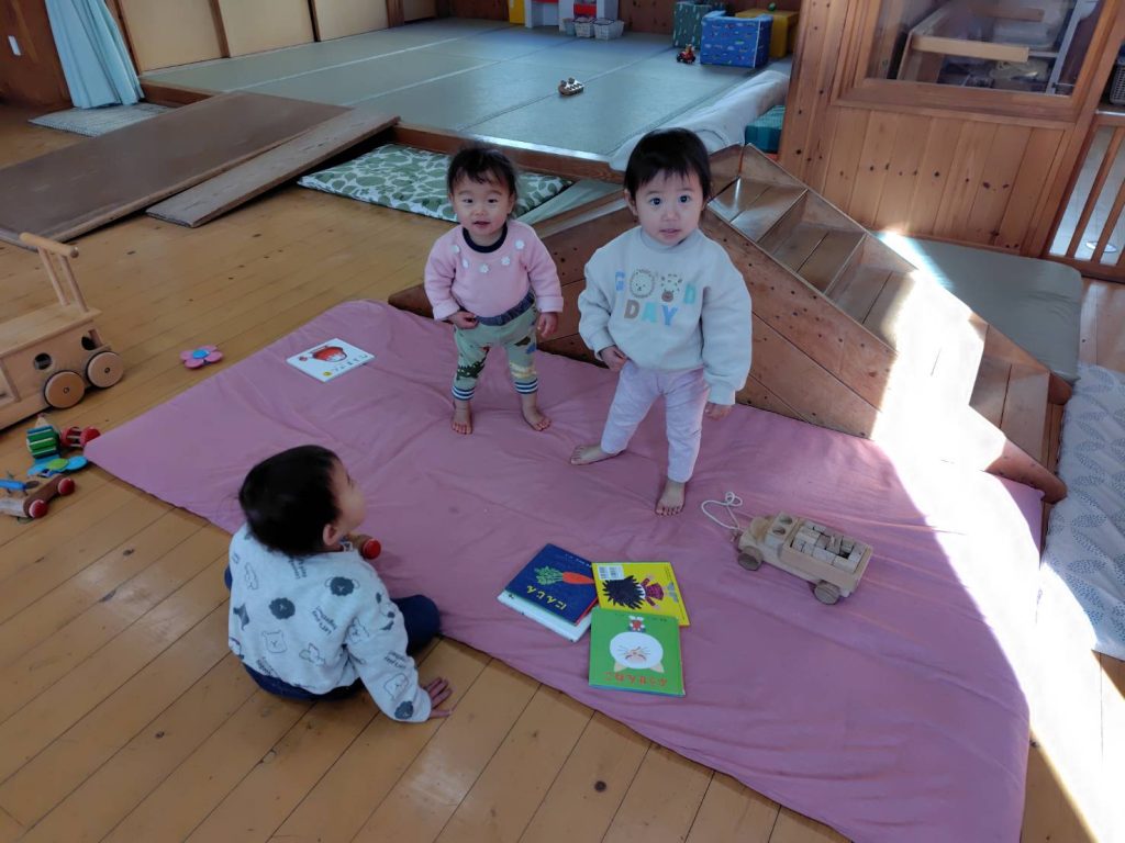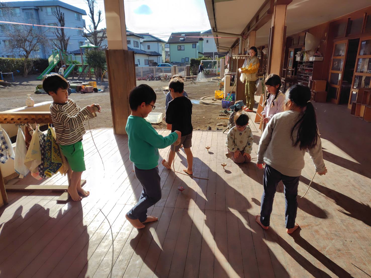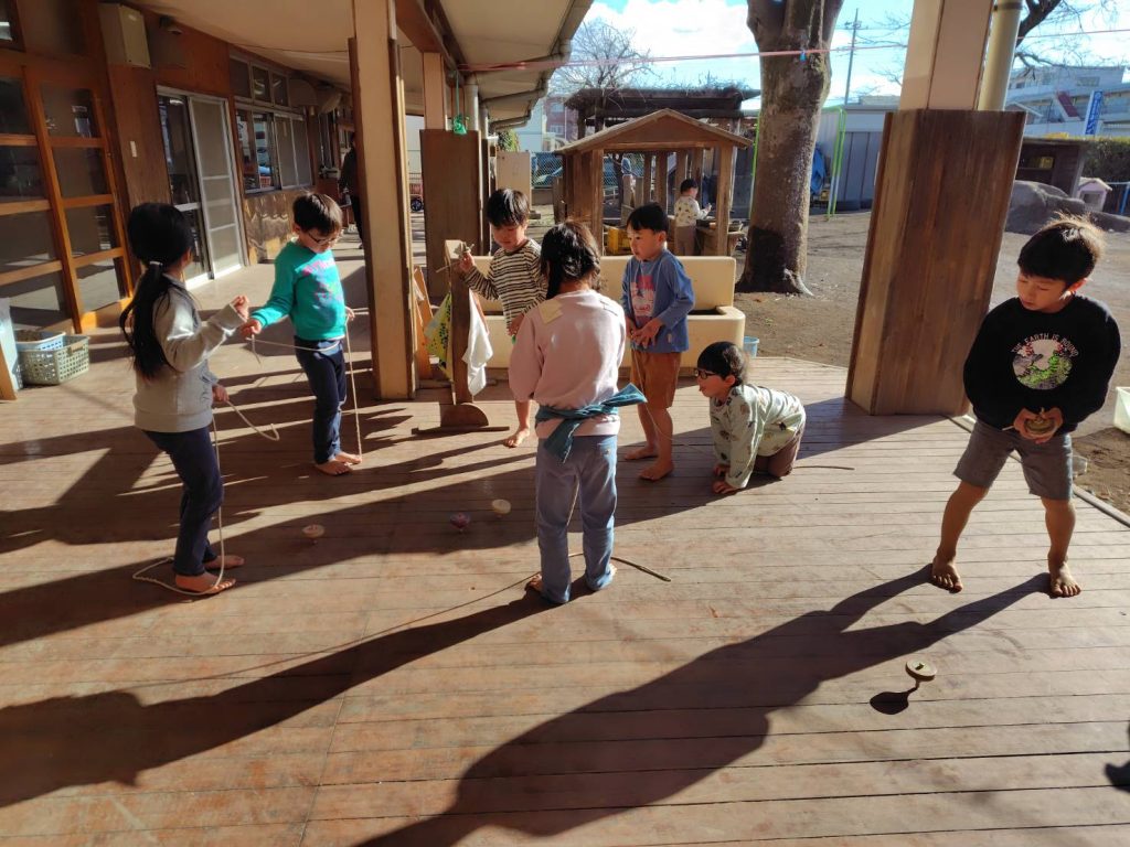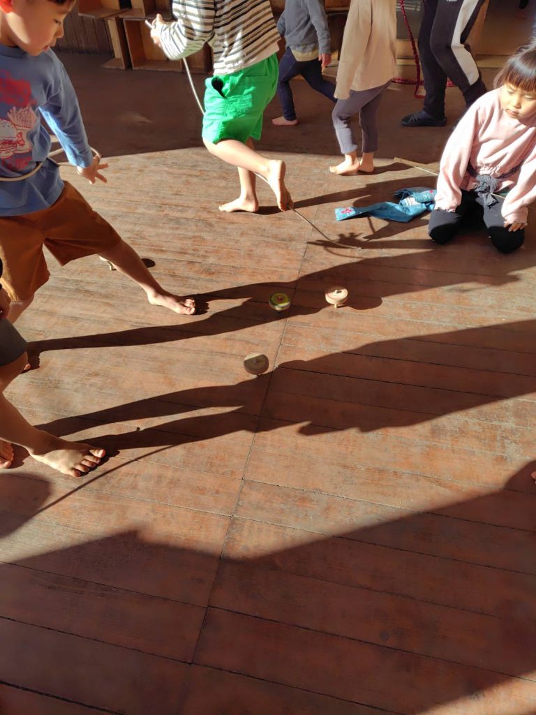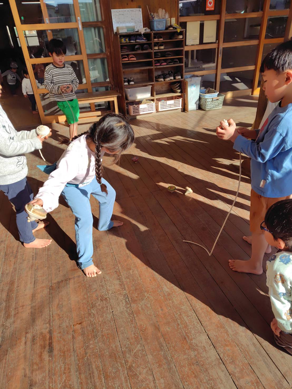 ひまわりさん(5歳児)も暖かい陽だまりの廊下でコマまわし