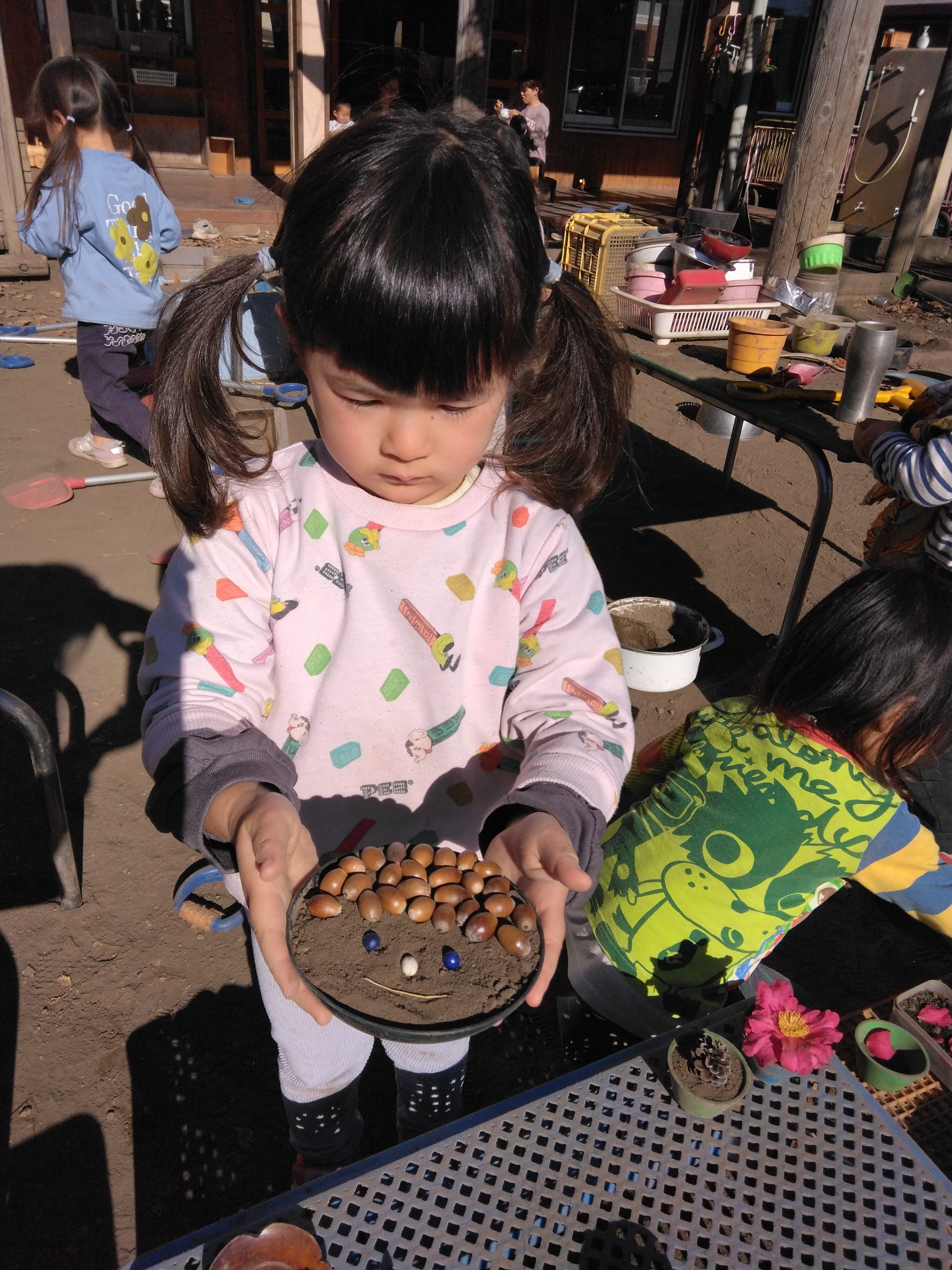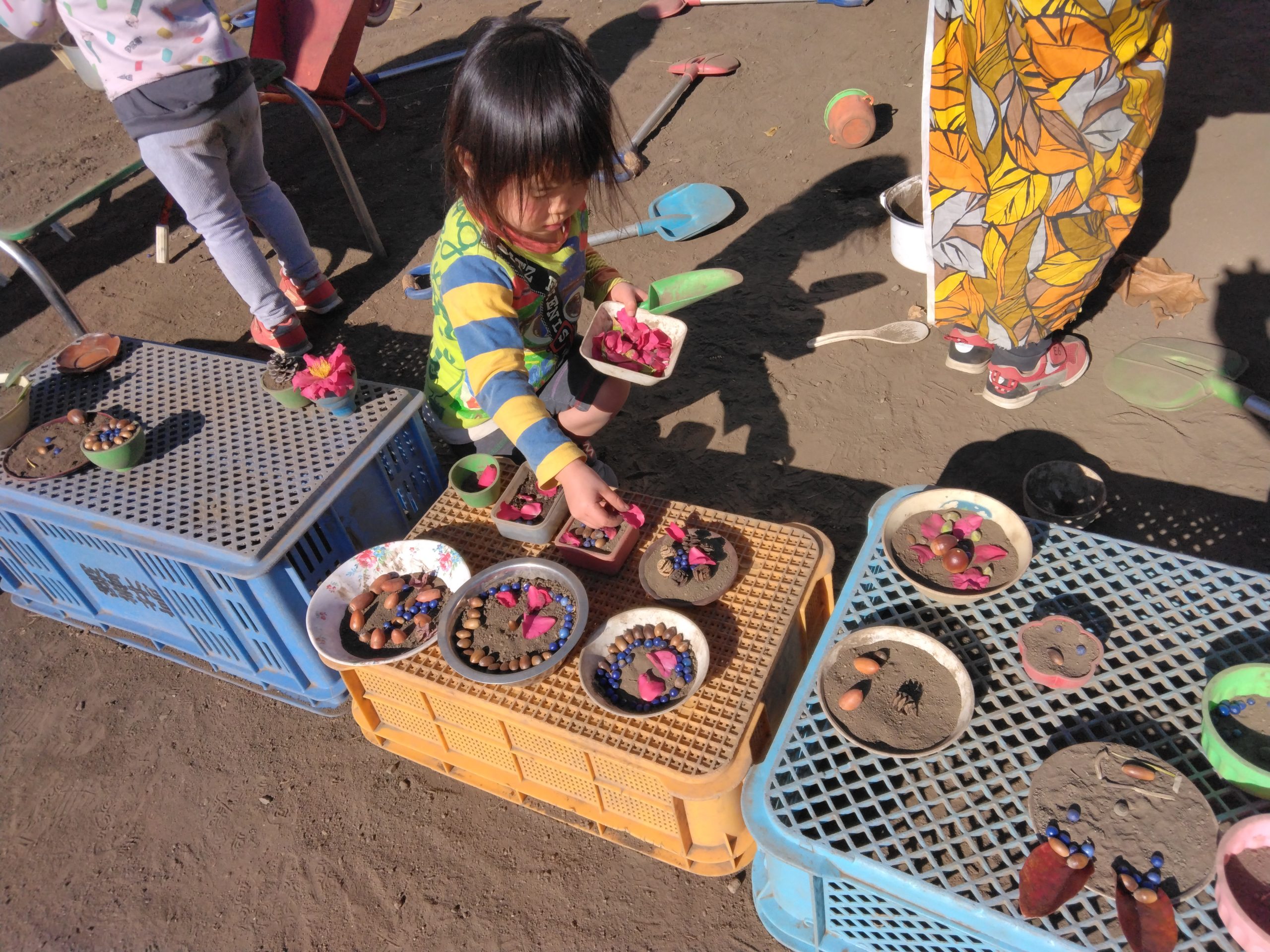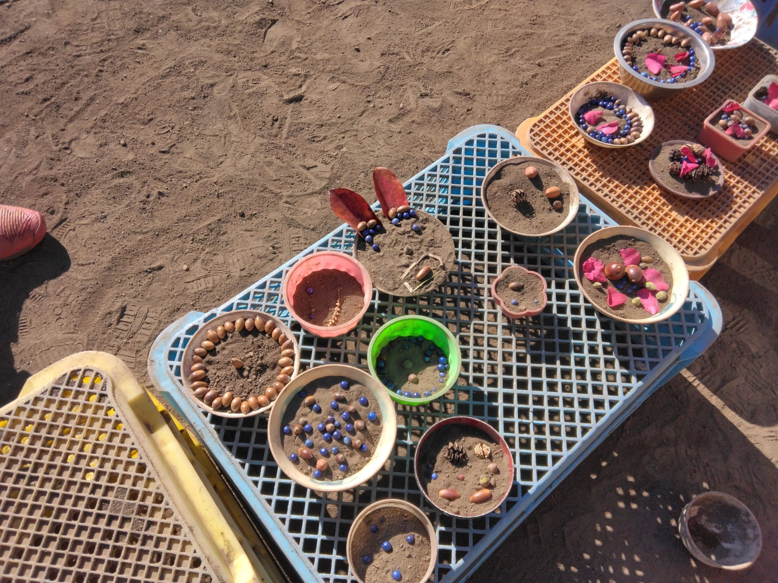 花びら、どんぐり、はずみ玉・・・今日の散歩でとってきた実を使ってお料理づくり