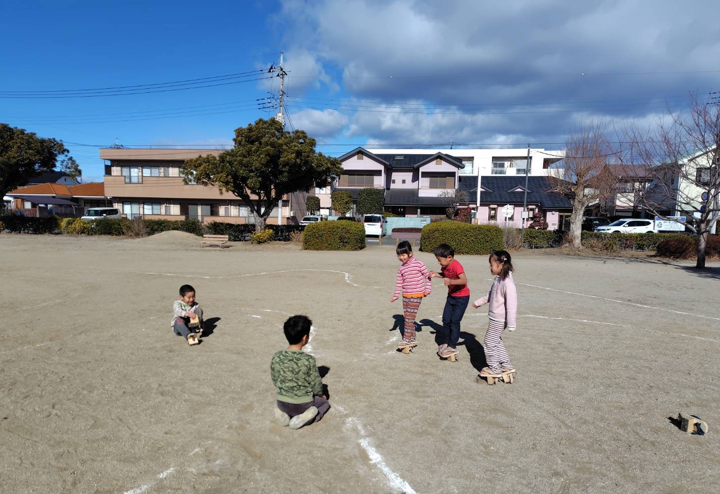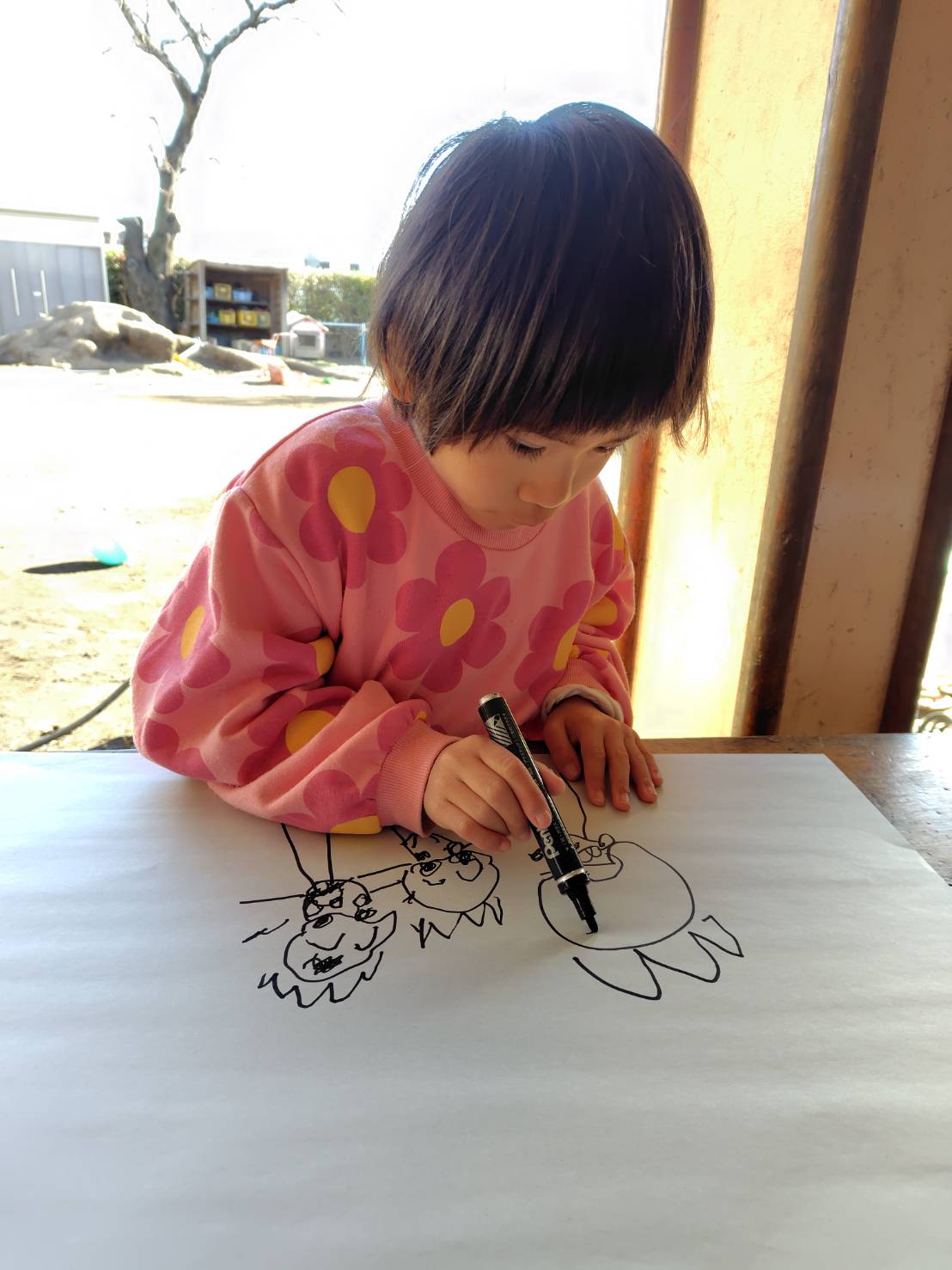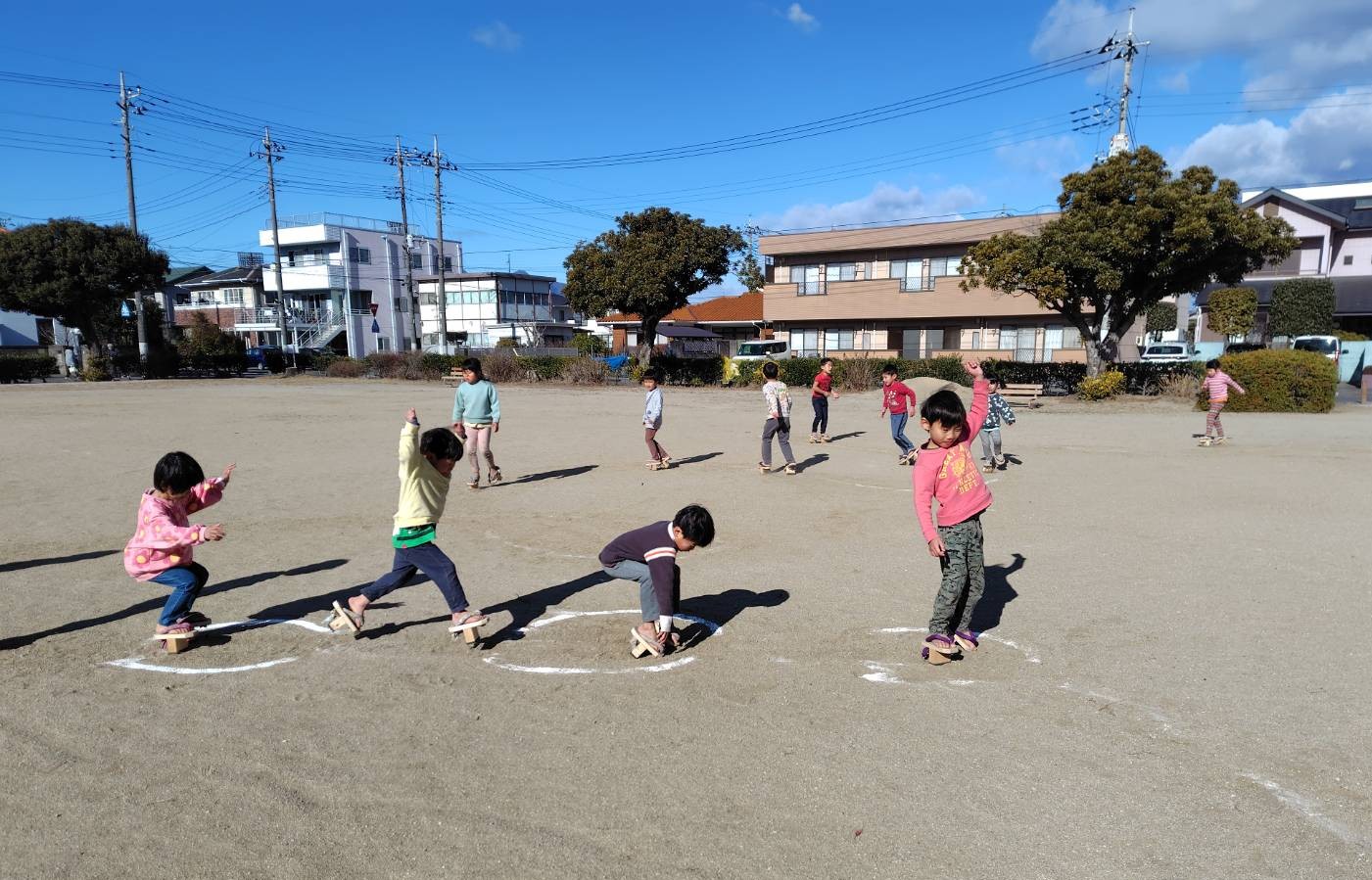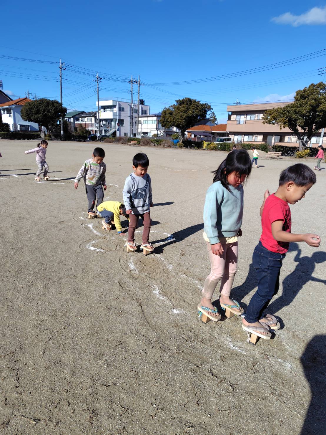 4歳児と散歩・・・ 1月21日、ゆり組さん(4歳児)と散歩に行きました。 クリスマスプレゼントでもらった一本下駄で遊びました。 白線を描くと子どもたちが上手に歩き出します。 丸から丸へ ピョンとはねてみたりジャンプが上手 一本下駄を履いてひょうたん鬼ごっこ オニさん タッチできるかな?? 木馬に乗ってみたよ 4歳児とお絵描き