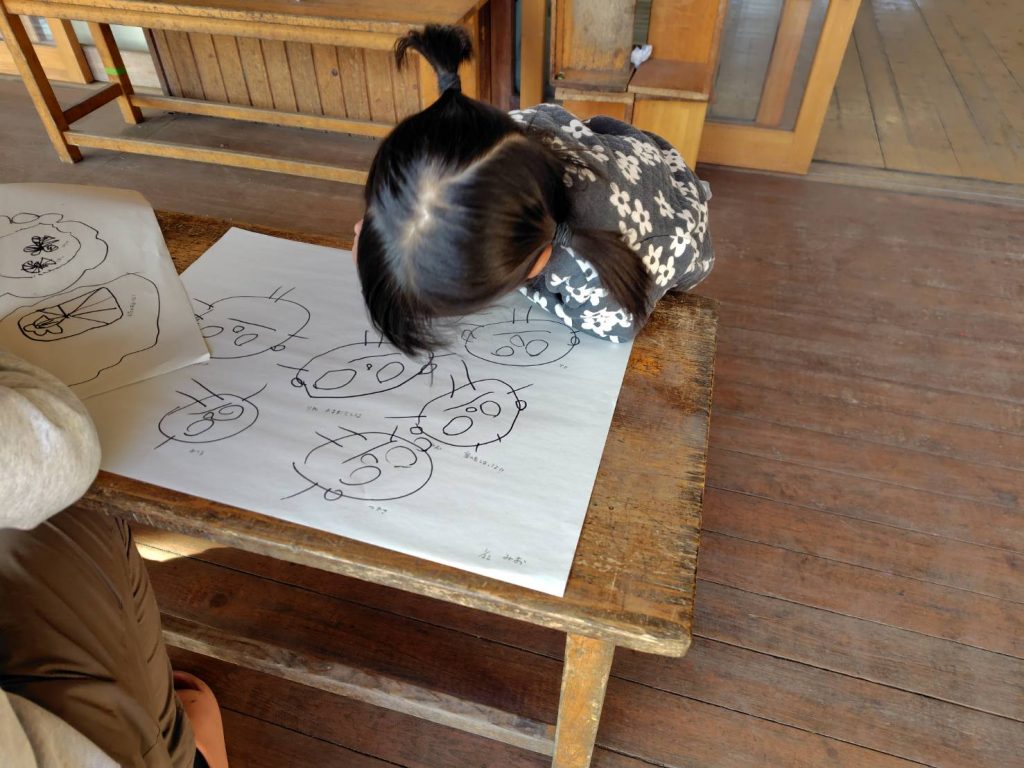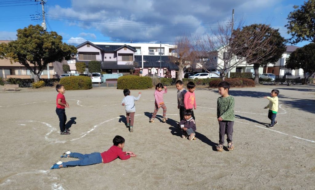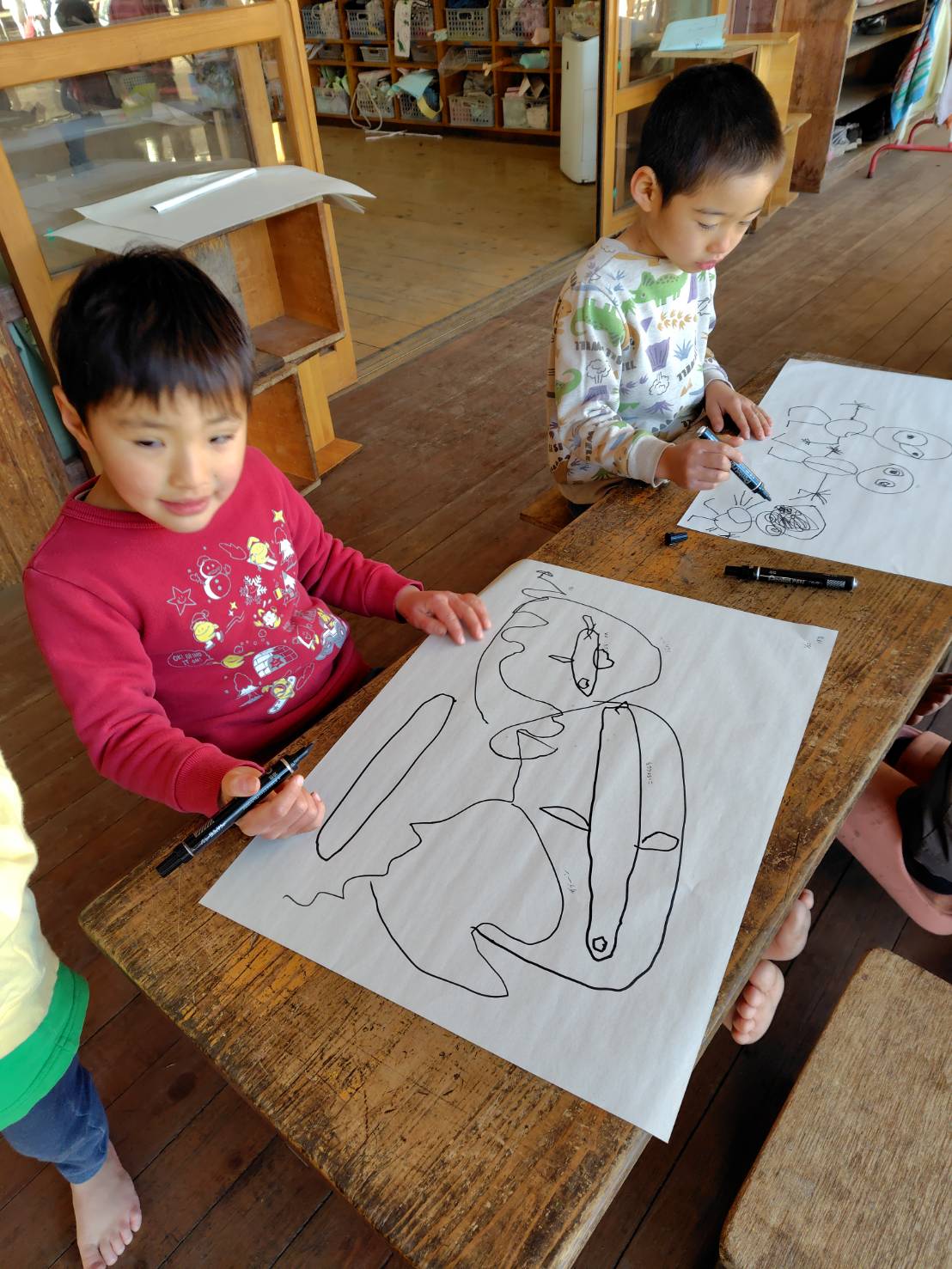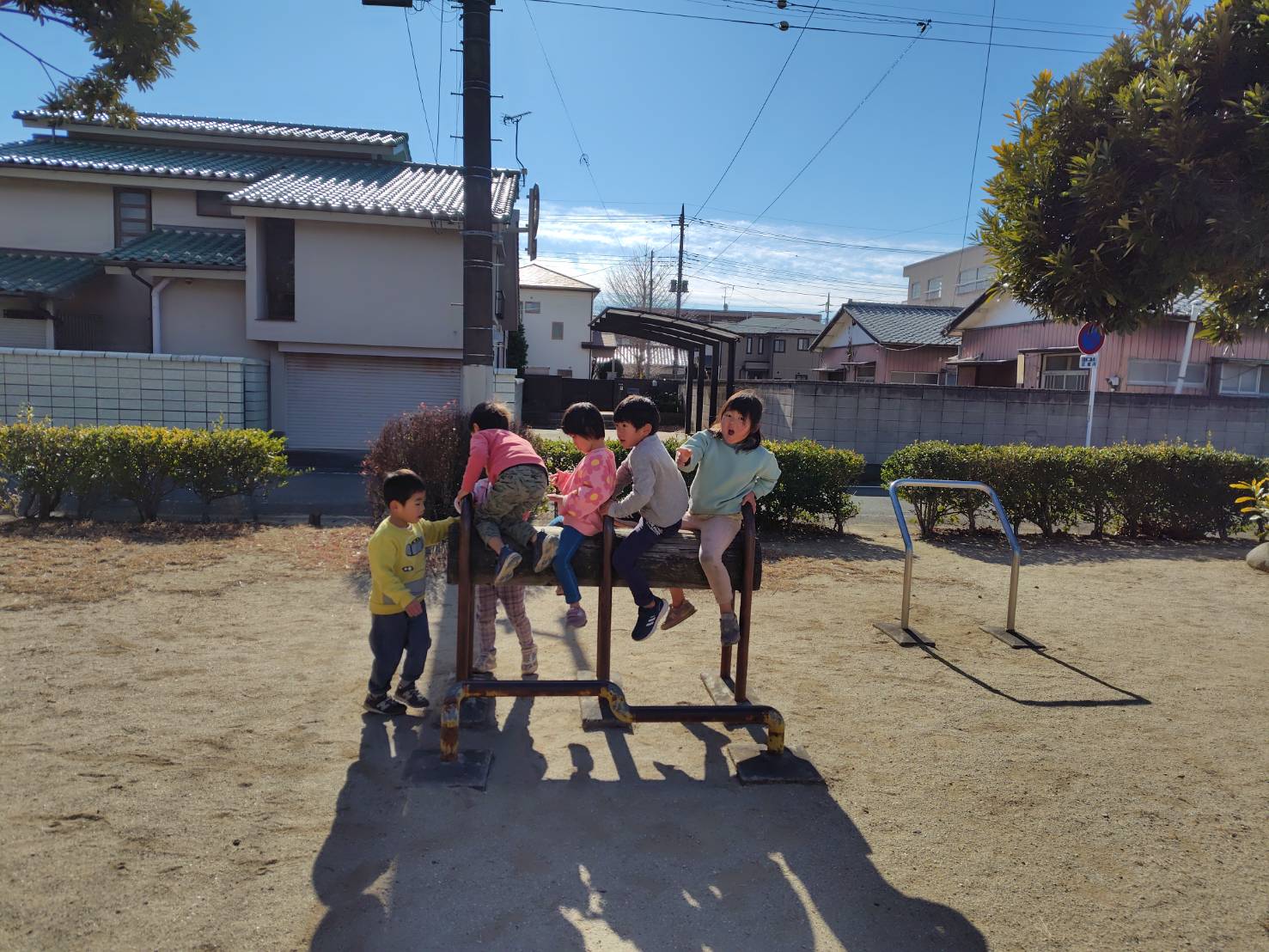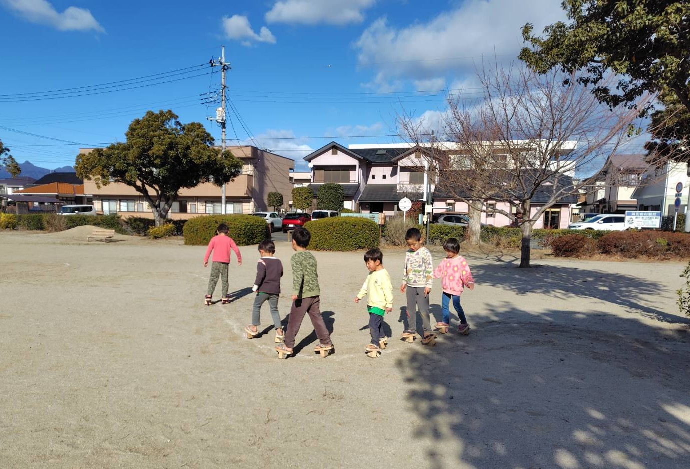 4歳児と散歩・・・ 1月21日、ゆり組さん(4歳児)と散歩に行きました。 クリスマスプレゼントでもらった一本下駄で遊びました。 白線を描くと子どもたちが上手に歩き出します。 丸から丸へ ピョンとはねてみたりジャンプが上手 一本下駄を履いてひょうたん鬼ごっこ オニさん タッチできるかな?? 木馬に乗ってみたよ 4歳児とお絵描き